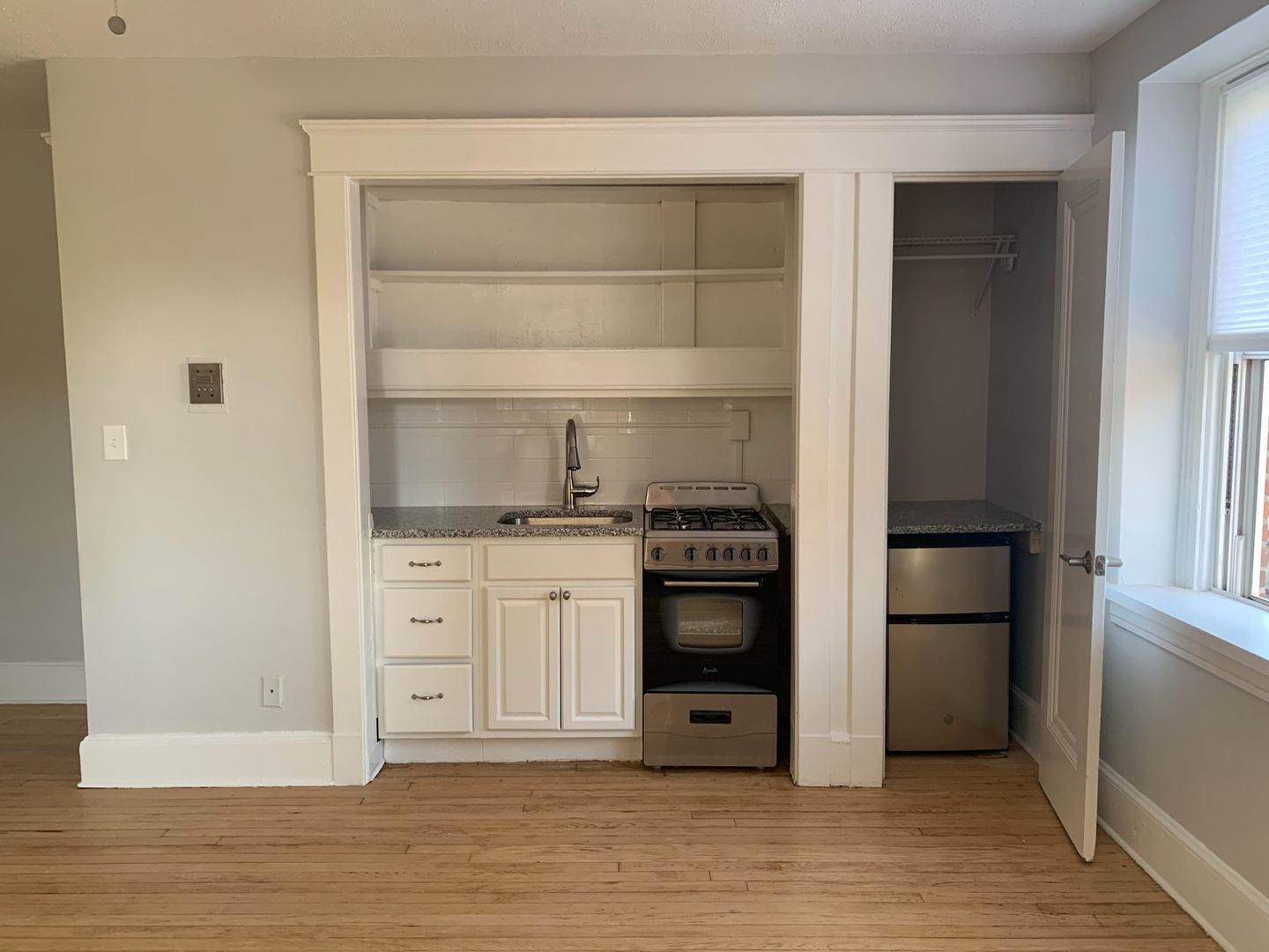 Front corner studio apartment with a large walk-in closet and a utility closet. Open concept with newer kitchen and bathroom (2019). This building has an elevator and is super close to Yale's main campus, lots of shops, and eateries.